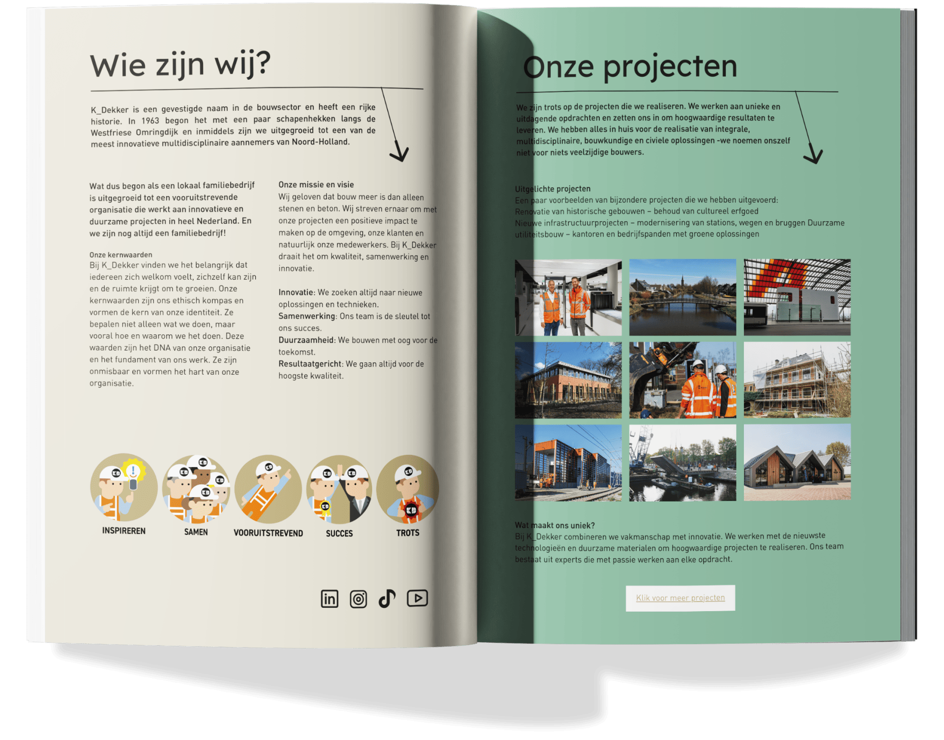 Als we dan toch een beetje mogen opscheppen: K_Dekker bouw & infra is de aannemer die alles in huis heeft voor de realisatie van integrale, multidisciplinaire, bouwkundige en civiele oplossingen. We zijn dus puur als team verantwoordelijk voor elk succes. En we weten: wat we samen doen, doen we beter. Omdat we nooit afhankelijk zijn van andere partijen, zijn de lijnen kort en is de overdracht zonder gedoe. Ons team bestaat dan ook uit toppers, die zich betrokken voelen bij hun werk. Niemand doet alleen zijn eigen klus en we zijn pas klaar als we allemaal trots kunnen zijn. Niet alleen op het resultaat overigens. De weg ernaartoe is net zo belangrijk. We doen de dingen graag goed, veilig en duurzaam. In een familiebedrijf zorg je immers voor elkaar en voor de volgende generaties.